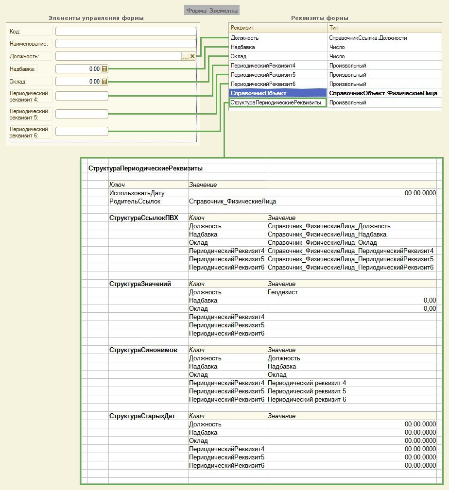 Например, для Справочника Физические лица такими данными могут быть Оклад, Надбавка, Должность, - размещаемые не в самом Справочнике, а в регистре сведений.