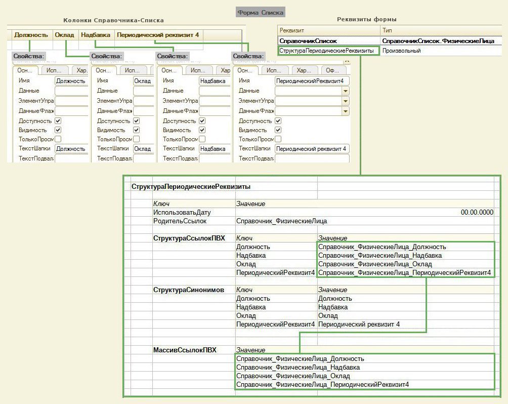 Аналогично форме элемента, в реквизите СтруктураПериодическиеРеквизиты в процессе работы создается структура и в нее помещаются различные служебные данные, необходимые для функционирования механизма периодических реквизитов для данного конкретной формы списка справочника.