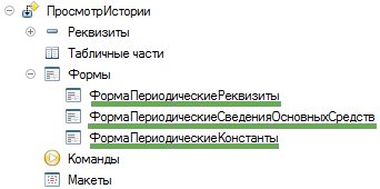 Отдельно нужно сказать про формы обработки ПросмотрИстории. Она имеет несколько форм. Для каждого регистра сведений с период.реквизитами отдельная форма. Имя формы должно назначаться по правилу: «Форма» + имя регистра сведений.