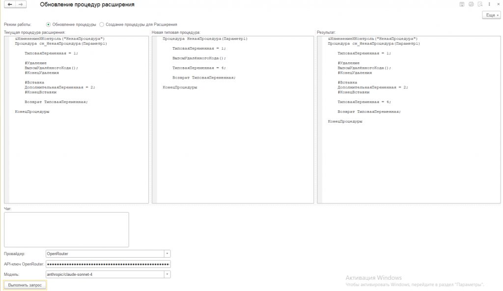 В поле «Текущая процедура расширения» вставляется код существующей процедуры расширения (с аннотациями &Перед, &После, &Вместо, &ИзменениеИКонтроль), а в поле «Новая типовая процедура» — код обновлённой процедуры из новой версии конфигурации поставщика. ИИ анализирует оба текста и формирует итоговую процедуру расширения: берёт новую типовую процедуру как основу и переносит в неё все кастомные блоки кода, сохраняя аннотации расширения.