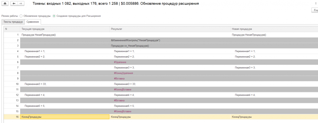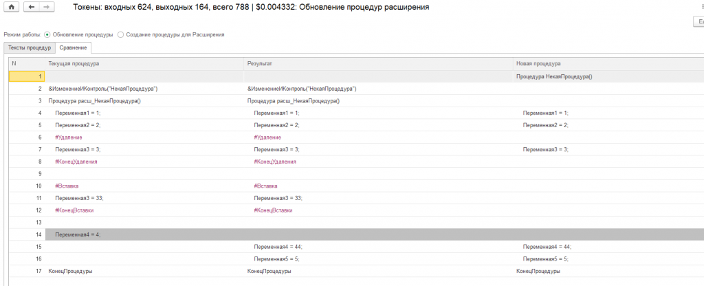 Обработка отправляет тексты процедур в выбранную нейросеть и получает готовый результат для дальнейшего переноса в расширение. После получения результата автоматически формируется таблица построчного сравнения всех трёх текстов.
