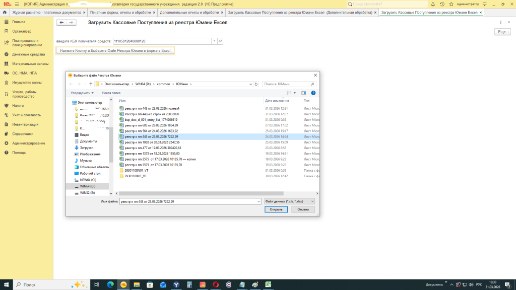 Предлагаемая обработка использует стандартный вывод из реестра из Электронного бюджета в виде Эксель файла и на основании информации в нем создает и проводит документы Кассовое поступление в программе 1С: БГУ 2. Поскольку каждый реестр направляется на какой-то свой КБК дохода, указанный в общем для реестра Платежном поручении, на форме обработки нужно выбрать КБК, который запишется во все создающиеся документы, остальные реквизиты документов заполняются из реестра Электронного бюджета.