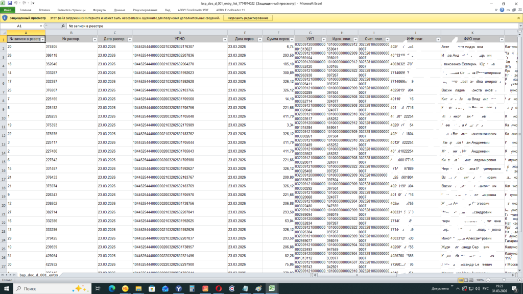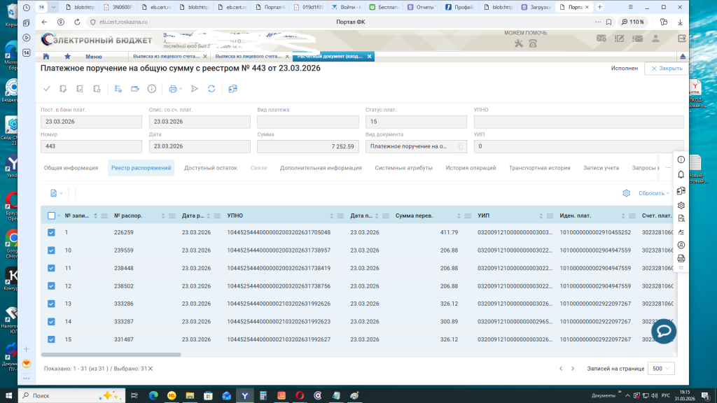 Часто (практически ежедневно) в Электронный бюджет приходят Платежные поручения на общую сумму платежей, включенных в реестр-приложение. Эти платежи из реестра также необходимо оформить каждый на свой документ Кассовое поступление.