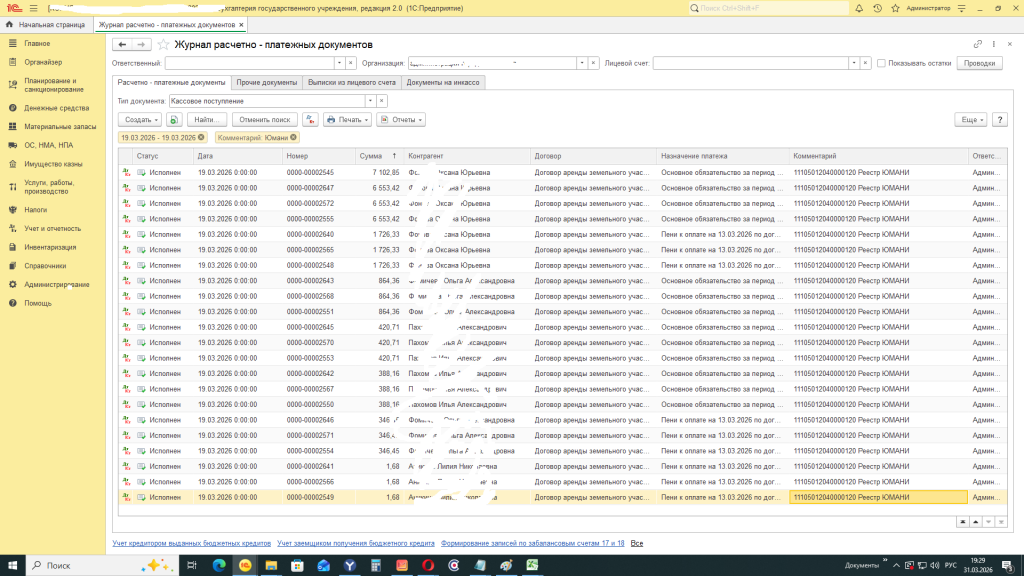 Ежедневная работа бухгалтера организации Администратора доходов (например, Администрации города) во многом состоит в заведении документов Кассовое поступление, которыми отражаются поступления дохода в бюджет от арендаторов муниципальной собственности.