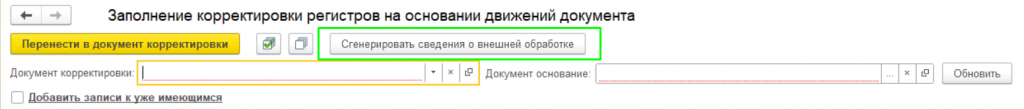 Добавление выбранных движений к действующим движениям документа. Для этого в форме обработки следует установить флажок «Добавить записи к уже имеющимся»;