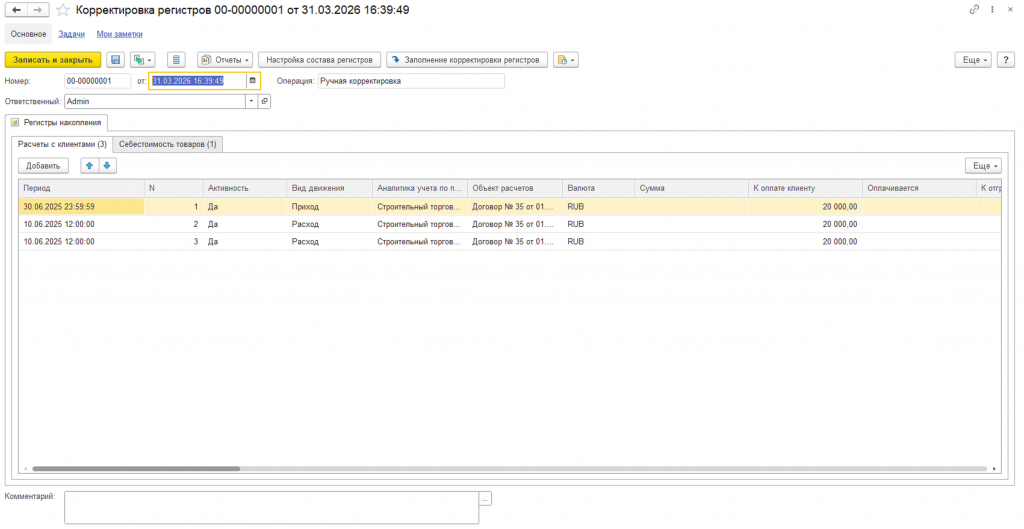 В итоге, после переноса данных в документ корректировки, будут заполнены соответствующие вкладки регистров накопления/сведений согласно выбранному режиму переноса.
