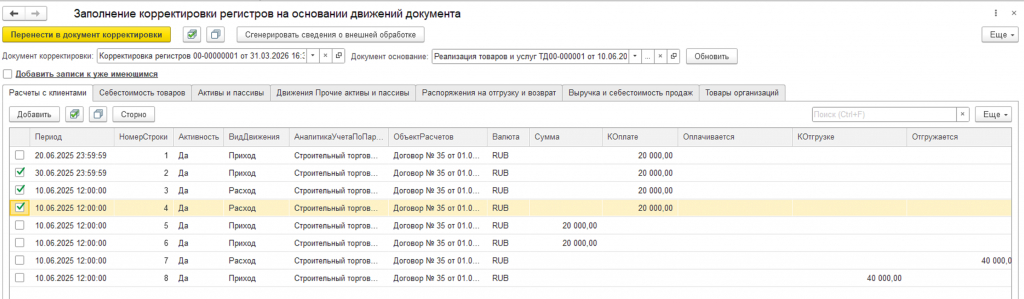 Перенос в документ корректировки выбранных строк движений работает в двух режимах: