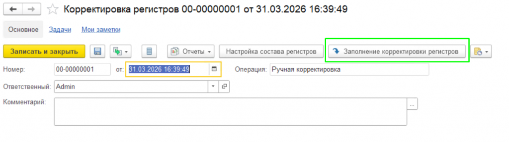 Заполнение документа «Корректировка регистров»