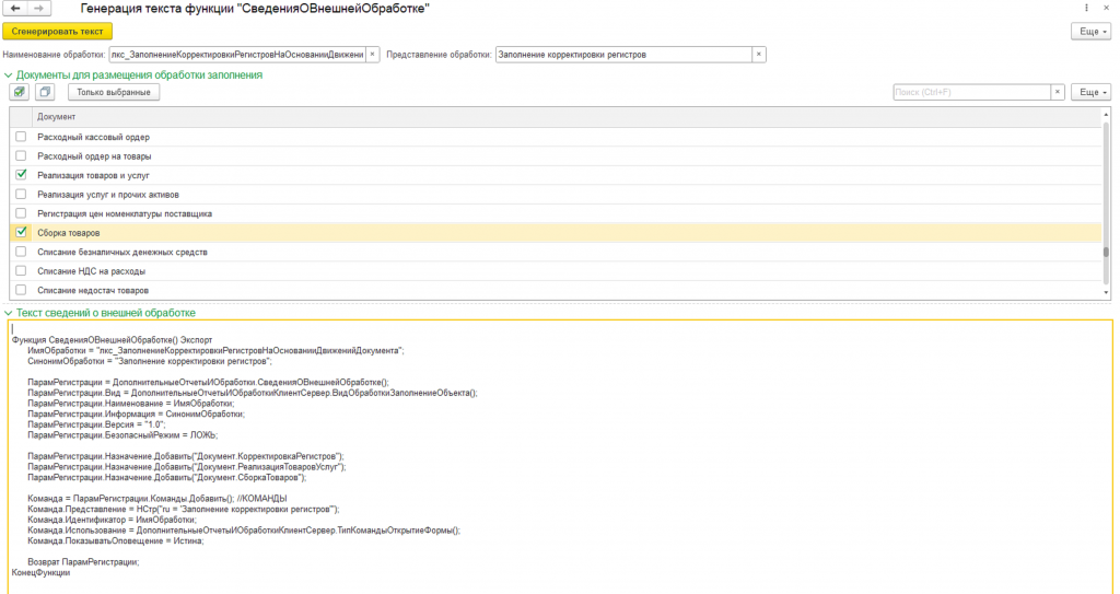 В открывшейся форме указываем документы, к которым необходимо подвязать вызов представленной обработки. Документ «Корректировка регистров» выбирать не надо, так как он автоматически попадет в генерируемый текст функции. Далее щелкаем по кнопке «Сгенерировать текст» и заменяем в модуле объекта обработки функцию «СведенияОВнешнейОбработке», текстом, который появится в поле «Текст сведений о внешней обработке». После вышеописанных действий подключаем дополнительную обработку, используя типовой механизм («НСИ и администрирование» -> «Печатные формы, отчеты и обработки» -> «Дополнительные отчеты и обработки»)