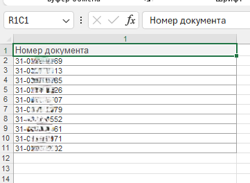 В обработке предусмотрена кнопка для загрузки номеров документов из Excel . В листе Excel должна быть колонка "Номер документа".