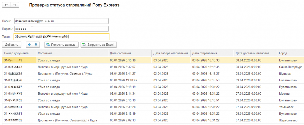 Добавляем номера отправлений в колонку "Номер документа" - нажимаем кнопку получить данные, загружаются статусы отправлений.