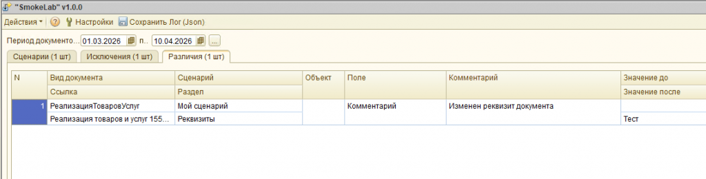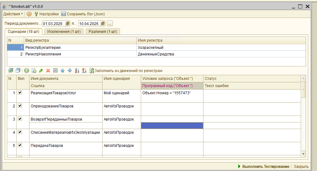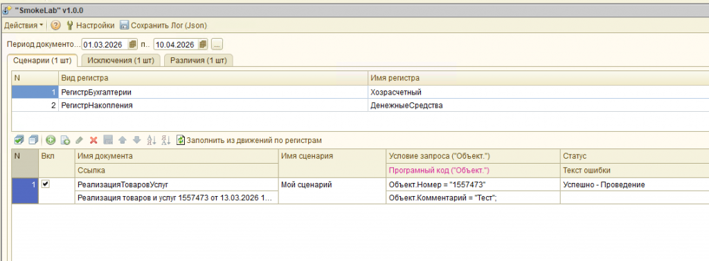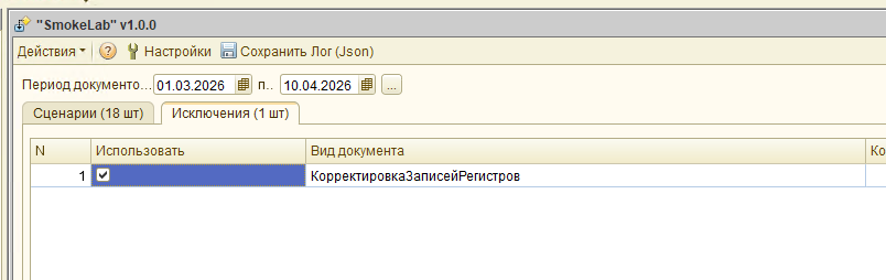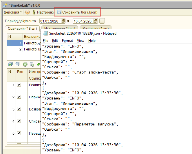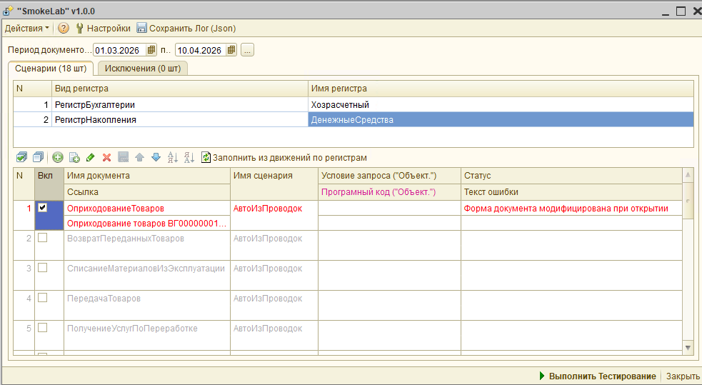 Сценарный анализ и тестирование документов "SmokeLab" (обычные формы): автоподбор документов, сценарное тестирование, анализ изменений, проверка форм и проведение, поддержка COM и JSON-логирование.