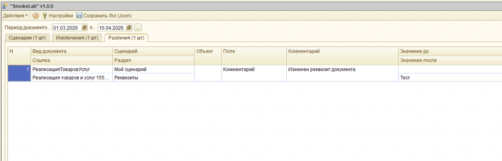 Сценарный анализ и тестирование документов "SmokeLab" (обычные формы): автоподбор документов, сценарное тестирование, анализ изменений, проверка форм и проведение, поддержка COM и JSON-логирование.