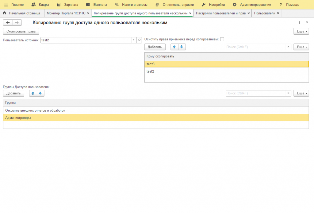 Копирование прав (групп доступа) из одного в нескольких. УТ 11, ЗУП, УНФ. Не работает в БП 3.