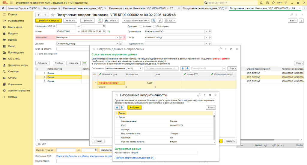 • Учитывает дубли по полям Номенклатура, ГТД, Страна и предлагает сопоставление;
