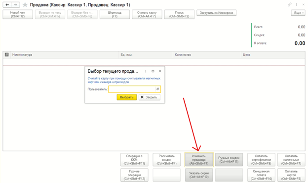В стандартной конфигурации УТ 11.5 нельзя повысить права кассира, даже при смене продавца через соответствующую кнопку. Ограничения прав настраиваются через «Правила продаж» в карточке пользователя.