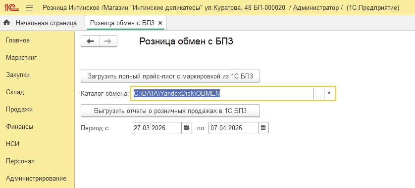 Порядок работы следующий: из 1С Бухгалтерия (БП3) выгружается список номенклатуры в xml-файл.   Ключевые поля: код (используется код SKU из регистра сведений КодыТоваровПодключаемогоОборудованияOffline), наименование, единица измерения, ставка НДС, цена (по виду цены), штрихкоды, вид номенклатуры (признак группы маркировки). Отдельным файлом выгружаются остатки товаров на начало дня. В 1С: Рознице перед первой загрузкой создаются вид цены с названием розничная, магазины, склады (названия должны соответствовать названиям складов в БП3, в названия можно добавить коды складов из БП3) например: Магазин "С/Х мясо молоко дары природы" ул.Мира, 5 код БП-000008, виды номенклатур с признаком маркировки, у моего клиента используются 2 группы: молочная продукция и упакованная вода.