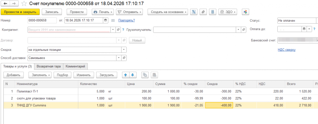 Поддержка отрицательных скидок (наценок) в счёте на оплату с распределением дополнительных расходов по номенклатуре.