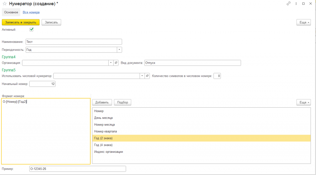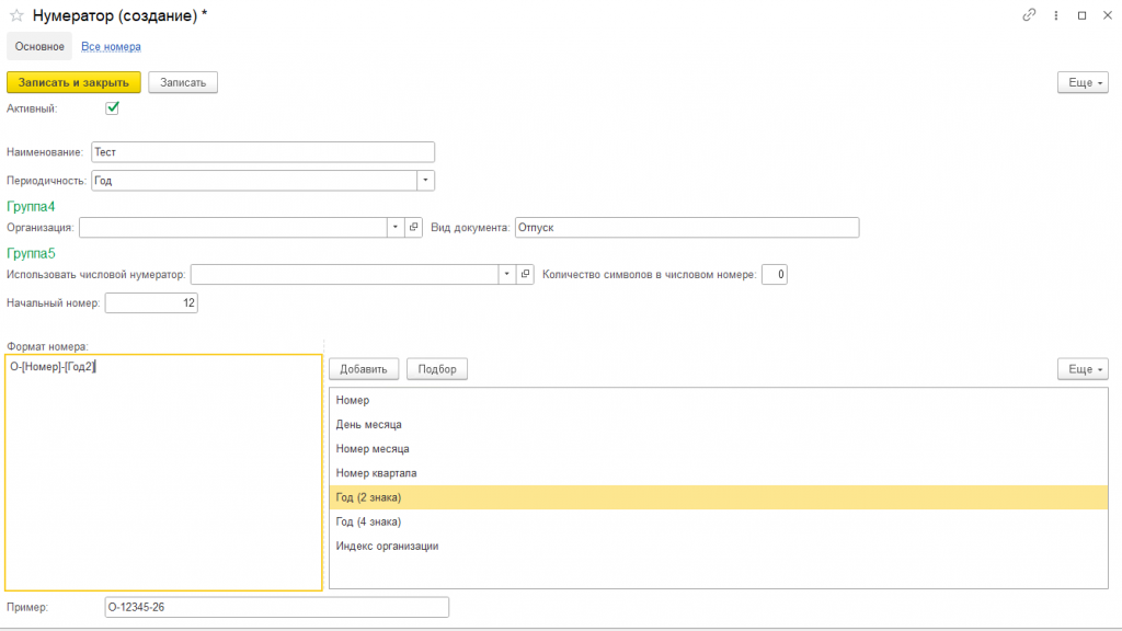- Начальный номер – номер с которого будет начинаться нумерация, если не заполнено, то будет первый документ начинать с номера 1.