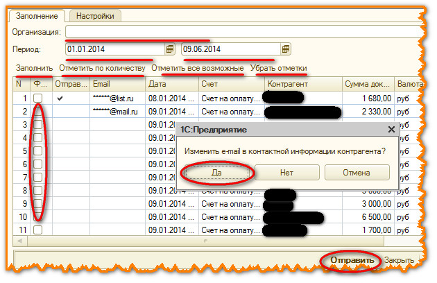 Открываем обработку в пользовательском режиме, устанавливаем отборы по организации и периоду. Нажимаем кнопку «заполнить.» В случае незаполненных параметров таблица счетов заполнится всеми непомеченными на удаление счетами, иначе – согласно установленным отборам (только непомеченные на удаления счета). Отмечаем галочками счета, которые необходимо отправить. Не отмечаются счета с незаполненным email-ом и отправленные ранее. После изменении адреса электронной почты контрагента в обработке вам будет предложено записать изменения адреса в базе данных (Рис 4).
