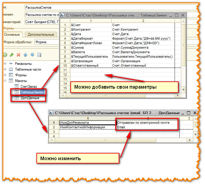 - Открываем макет обработки «ТаблицаЗамен», сюда можно добавлять свои параметры, для добавление данных в данную таблицу необходимы минимальные навыки программирования 1С. В теле и теме письма параметры из колонки 1 будут заменены значением функции Вычислить с параметром Значение2, где Счет – это ссылка на счет.