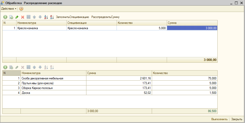 7.Реализовать обработку. Обработка должна распределять указанную сумму расходов по выпущенной производством продукции. Общая сумма расходов, состав и количество выпущенной продукции указывается в этой обработке (на форме). Распределение суммы выполняется пропорционально количеству. Обработка должна отобразить результат распределения. При реализации учесть, что все суммовые показатели округляются до 2-ух знаков, количественные – до 3-ех.
