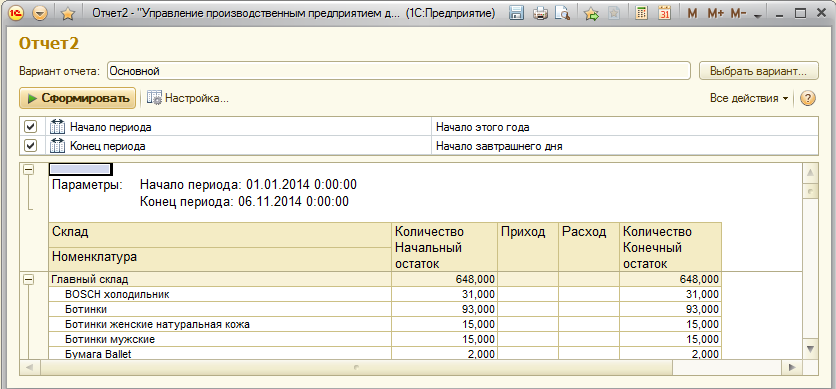 4. Написать отчет в СКД по нахождению остатков на складе (-ах) на произвольную дату.
