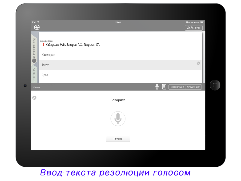 - режим ввода текста резолюции голосом. Произнесите текст и приложение распознает его.