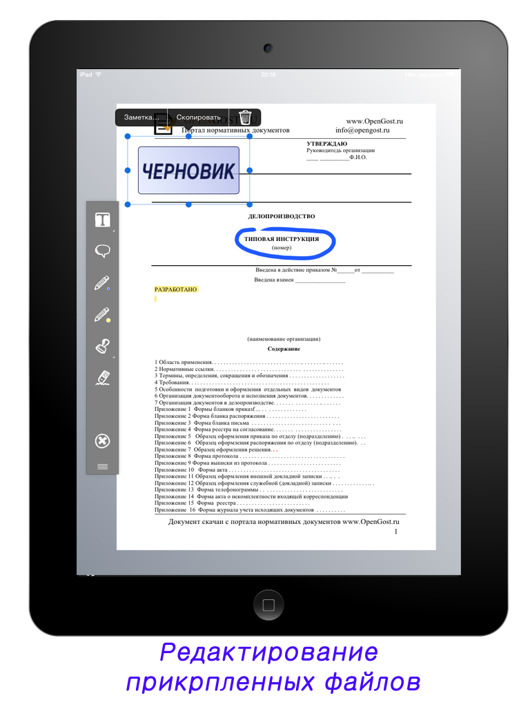 - аннотирование файлов: выделение текста, рисование, добавление штампов, подписей, фото и аудио;