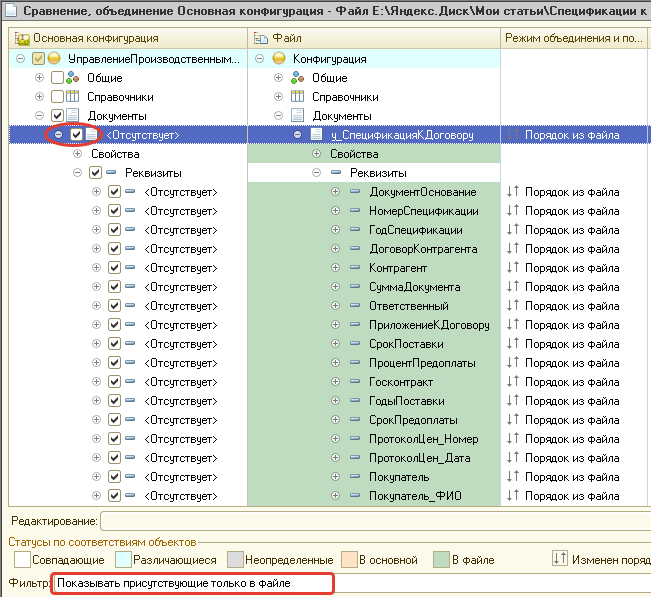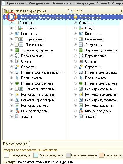 2. В окне сравнения конфигураций снимаем галку с корневого элемента. Затем включаем фильтр Показывать присутствующие только в файле