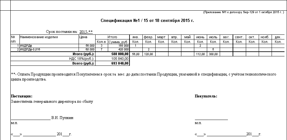 • заполняется табличная часть Список номенклатуры для данной спецификации - здесь указывается поставляемое количество номенклатуры для каждого месяца спецификации, цена на товарную процукцию указывается один раз. Сумма вычисляется автоматически