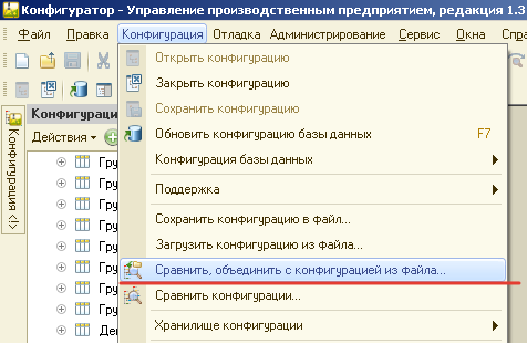 1. В конфигураторе: Конфигурация->Сравнить, объединить с конфигурацией из файла