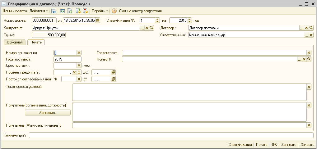 • Контрагент - собственно для какого контрагента делается спецификация