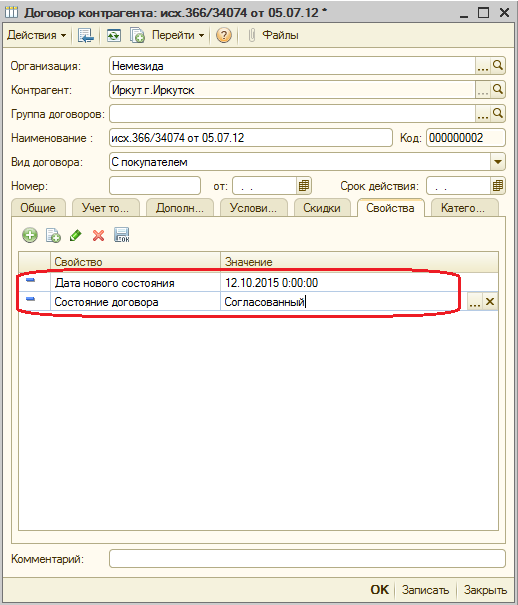 Для справочника "Договор контрагента" на закладку "Свойства" добавили новое свойство "Состояние договора" со значениями "Вернулся с разногласиями", "Заявка", "На подписи", "Направленный", "Согласованный", "Отказ" и свойство "Дата нового состояния". При изменении состояния договора менеджером отдела договоров проставляется дата нового состояния.