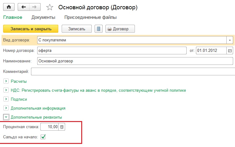 - "Процентная ставка" тип число. Определяет процентную ставку по договору.