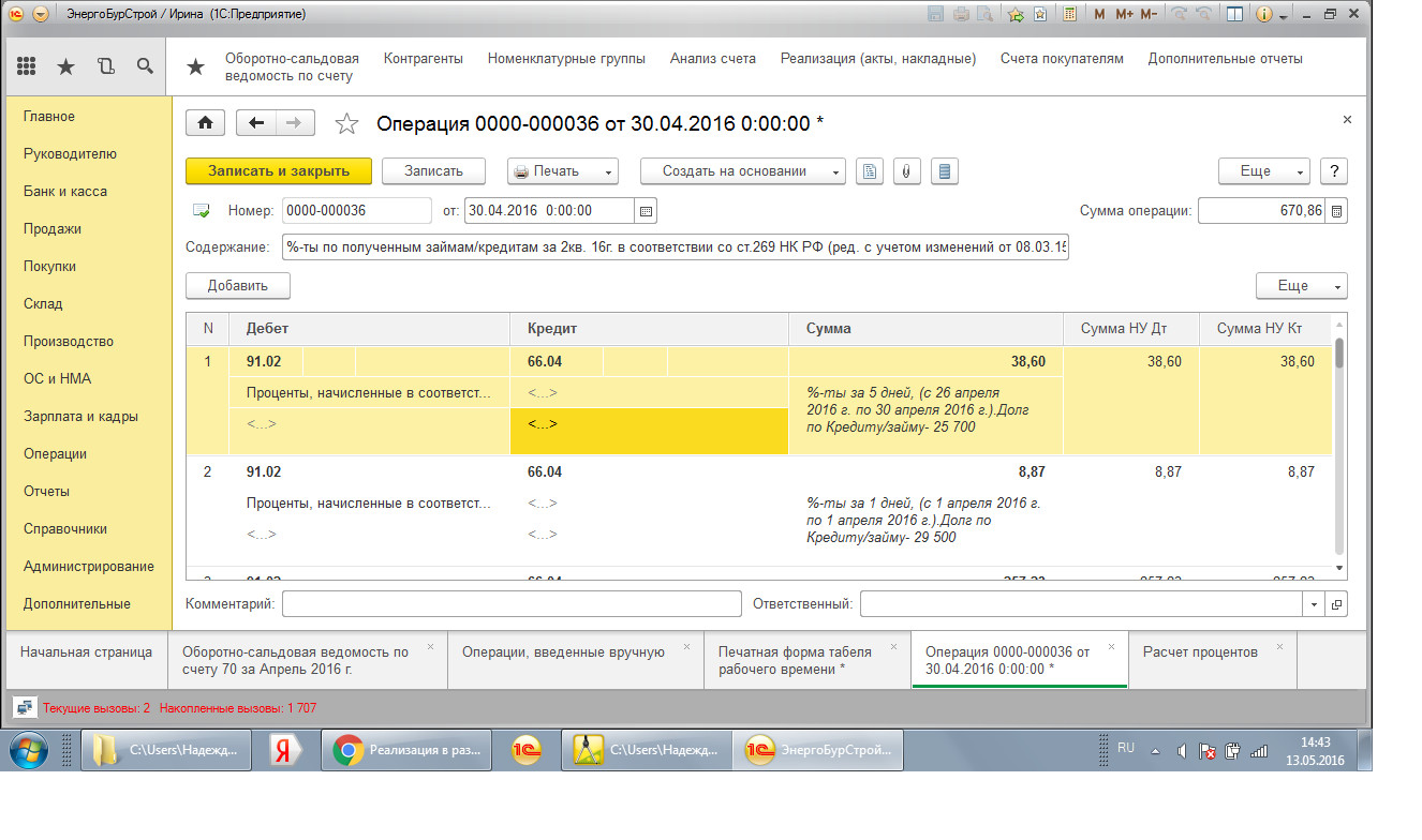 При запуске по умолчанию выбирается организация, установленная основной. При ведении учета более одной организации выбирается нужная. Конец периода по умолчанию конец текущего месяца. Первая табличная часть автоматически заполняется остатками по 66.01, 66.03, 67.01, 67.03, данные по первоначальной сумме на начало и конец расчетного периода устанавливаются автоматически, процент указывается вручную в табличной части. При нажатии кнопки Рассчитать во вторую табличную часть выводится расчет по выбранному договору. При нажатии кнопки Выполнить записывается Операция.