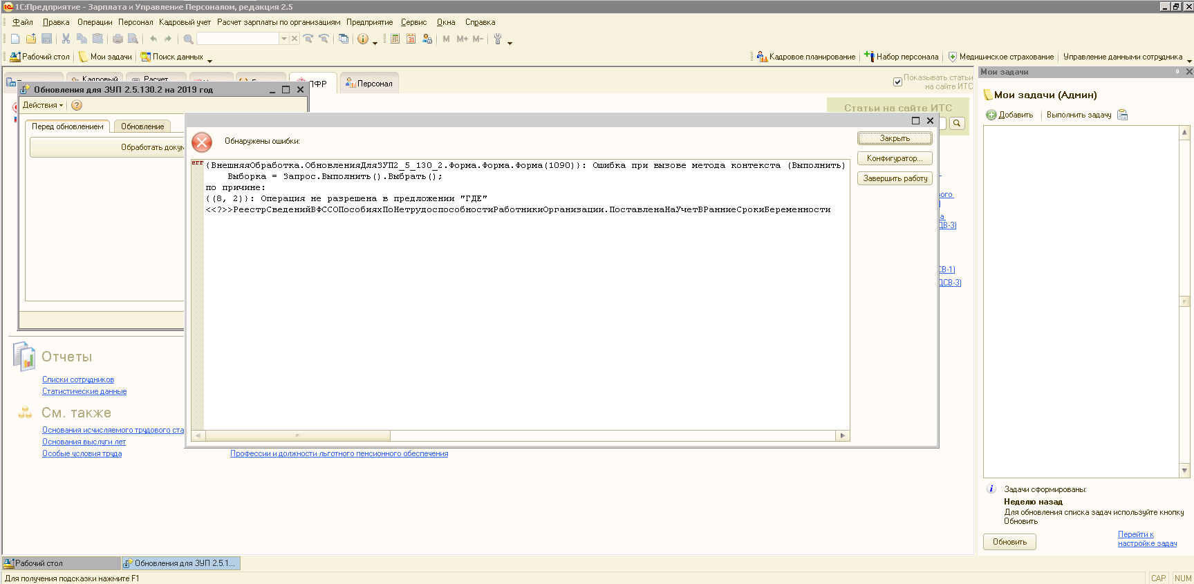 В связи со сменой типа реквизита "ПоставленаНаУчетВРанниеСрокиБеременности" в документах перед установкой обновления открыть обработку ОбновленияДляЗУП2_5_130_2.epf и на закладке "Перед обновлением" нажать на кнопку "Обработать документы".