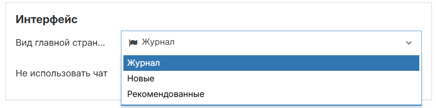 В данном блоке доступен выбор вида главной страницы сайта. По умолчанию у всех пользователей в качестве главной установлен Журнал портала. По желанию, вы можете установить на главную страницу Список публикаций, выбрав его во всплывающем меню.