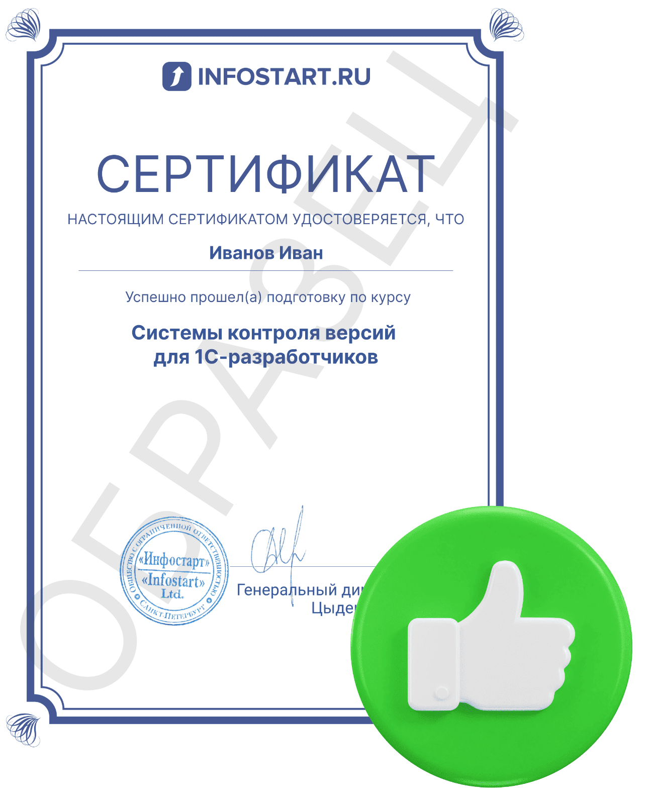 После успешного завершения курса «Системы контроля версий для 1С-разработчиков» выдается соответствующий электронный сертификат компании «Инфостарт» о прохождении курса