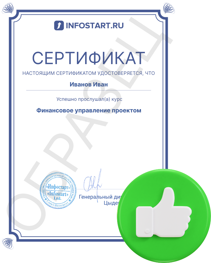 По итогам прохождения курса «Финансовое управление проектом» выдается соответствующий электронный сертификат компании «Инфостарт»