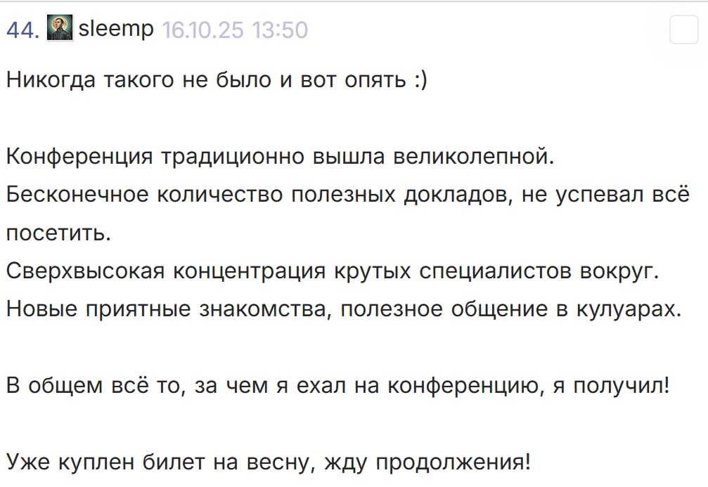При покупке от 2 билетов и более действуют специальные цены на участие со скидкой от 10 до 30%. Конференция посвящена взаимодействию внутри ИТ-команд и помогает ускорить процессы разработки, научить "говорить на одном языке" технарей и управленцев. Соберите коллег, приезжайте вместе — участвовать выгоднее и продуктивнее!