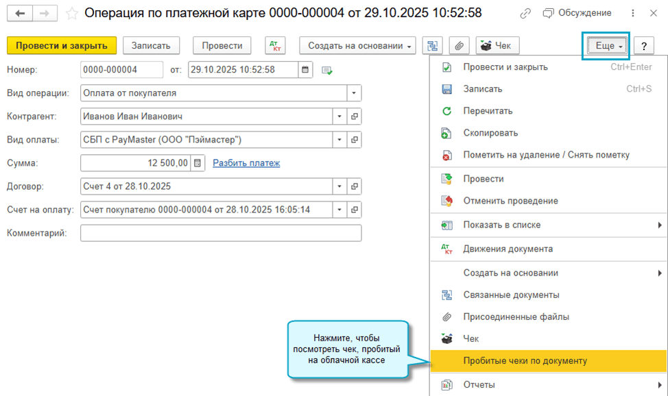 Помимо стандартного пробития чеков из тех же документов, что и на обычной кассе, для облачной кассы добавлена возможность автоматически пробивать чеки при загрузке данных по оплатам через СБП – актуально для случаев, когда покупатели оплачивают счета на оплату через СБП, и на каждого покупателя заводится отдельная карточка с указанием телефона или email.