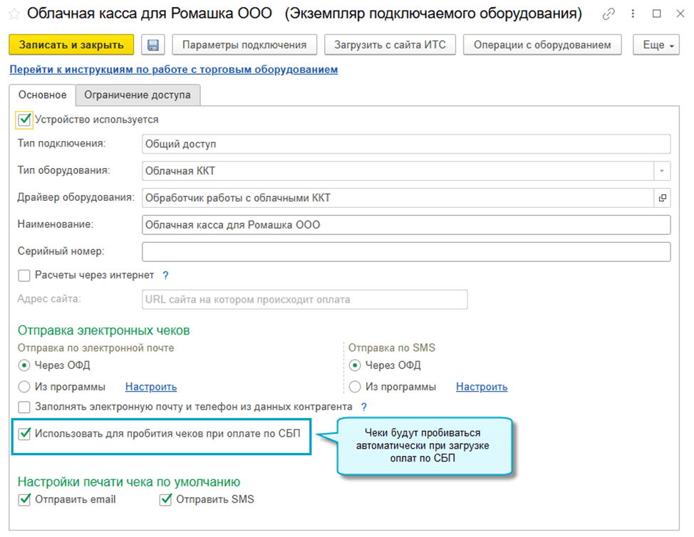 Чтобы после загрузки оплат по СБП чеки были автоматически пробиты на облачной кассе и отправлены покупателям, в настройках облачной кассы потребуется выставить соответствующую настройку.