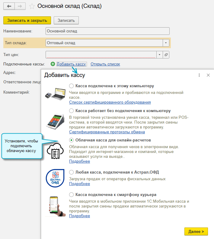 Облачная касса для дистанционных продаж и услуг на выезде в 1С:Бухгалтерии