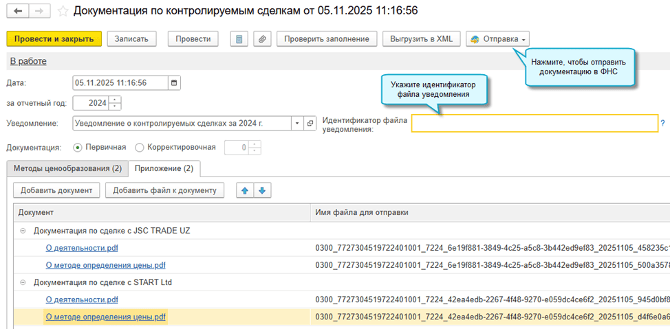 в версии КОРП добавлена возможность вместе с уведомлением о контролируемых сделках отправить в ФНС сопутствующую документацию в рекомендуемом формате (расширенные сведения о деятельности налогоплательщика, сведения об использованных методах при определении доходов и пр.).