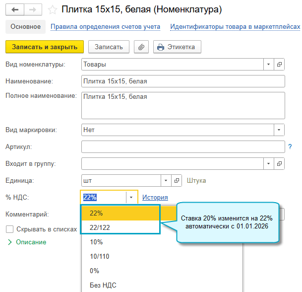 При этом учтено, что ставку НДС 22% вместо 20% планируется начать применять с 1 января 2026 года. Поэтому для тестового оформления счета или реализации по ставке 22% разработчики рекомендуют изменить рабочую дату в персональных настройках на 01.01.2026.