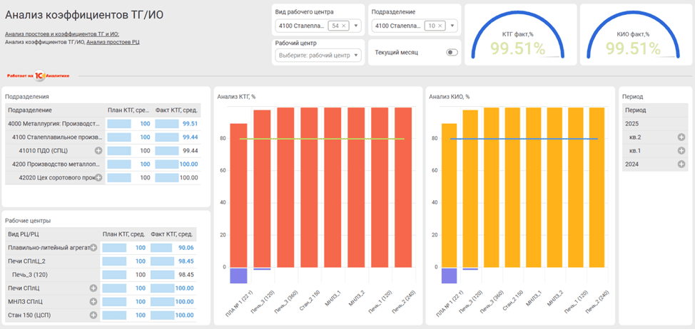 Аналитические панели "1С:Аналитика" для план-фактного анализа доступности металлургического оборудования, оперативного контроля данных причин и времени простоев оборудования, анализа выпуска продукции и обеспечения производства сырьем, оперативного анализа отгрузки металлургической продукции. |