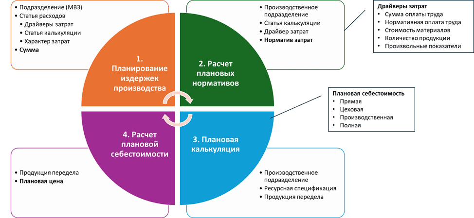 Планирование накладных расходов с расчетом плановых тарифов на единицу продукции, формирование полной себестоимости единицы продукции или полуфабриката |
