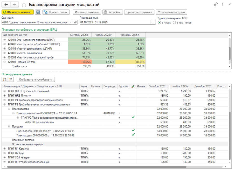 Интерактивная настройка распределения объемов производства позволяет моделировать различные варианты загрузки рабочих центров. Источник: 1с.ru