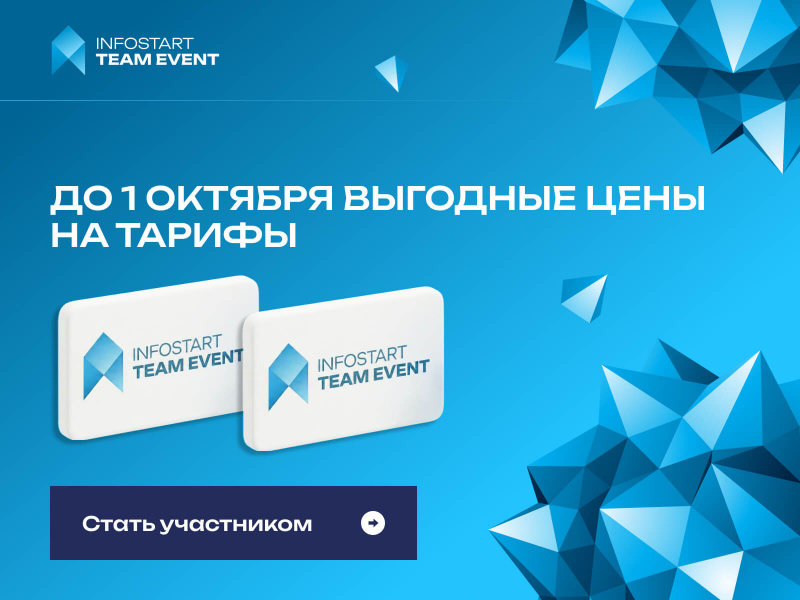 Продажи билетов на мероприятия 2026 года стартовали. У вас есть возможность получить скидку до 20%: воспользуйтесь опцией «2в1» и приобретайте билеты на INFOSTART TEAM EVENT 2026 и A&PM EVENT 2026 по самой выгодной цене.